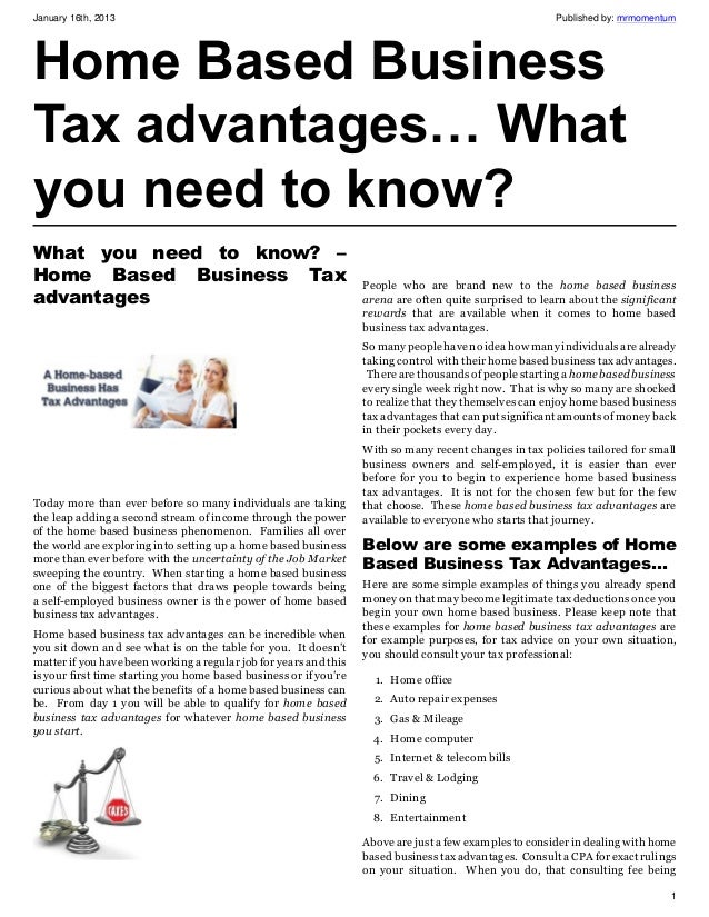 Tax Advantages Of A Home Based Business Operating a home based business has a number of income tax advantages that entrepreneurs may be unaware of, and consequently miss out on. ... Fetch Full Source